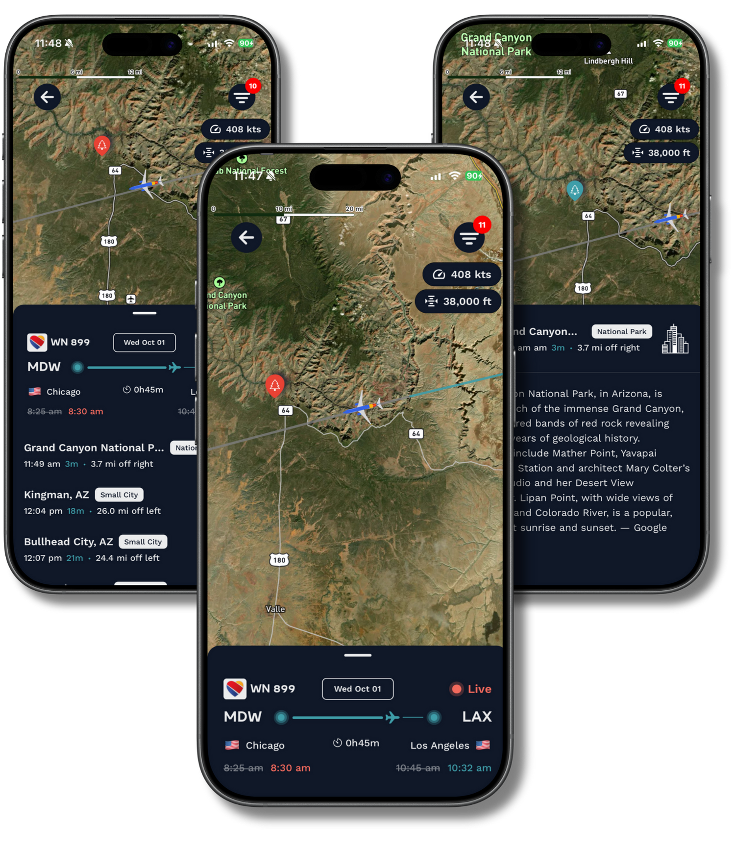 Open the app mid-flight and see exactly where you are and what’s below you. Your plane’s position updates in real time, revealing cities, stadiums, national parks, racetracks, and more as they pass beneath your window.